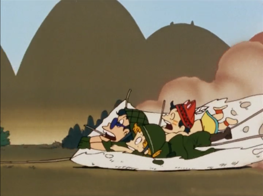 Taro and Akane shoot at each other with appropriate war outfits. Taro manages to shoot down Akane and Arale comes out to avenge her. Gatchan reveals themselves and they and Arale go into a little fencing match while they wear matching ninja-esque costumes.